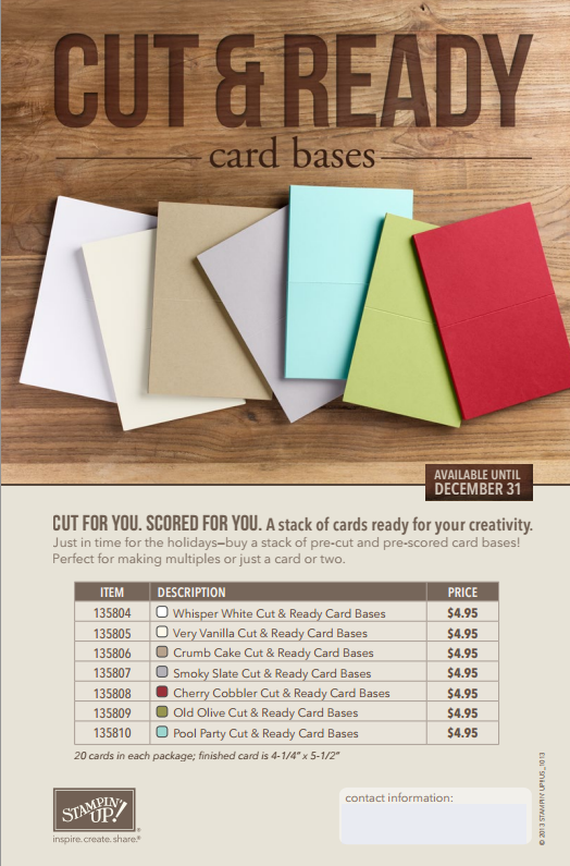 Through December 31, SU is offering a new trial product-our Cut & Ready Card Bases. These pre-scored, pre-cut card bases will make it easy for you to create a stack of cards in no time-or even just a card or two. Think of it . . . holiday cards, thank you cards, party invitations, and more in a snap! (We can hear you breathe a sigh of relief.)